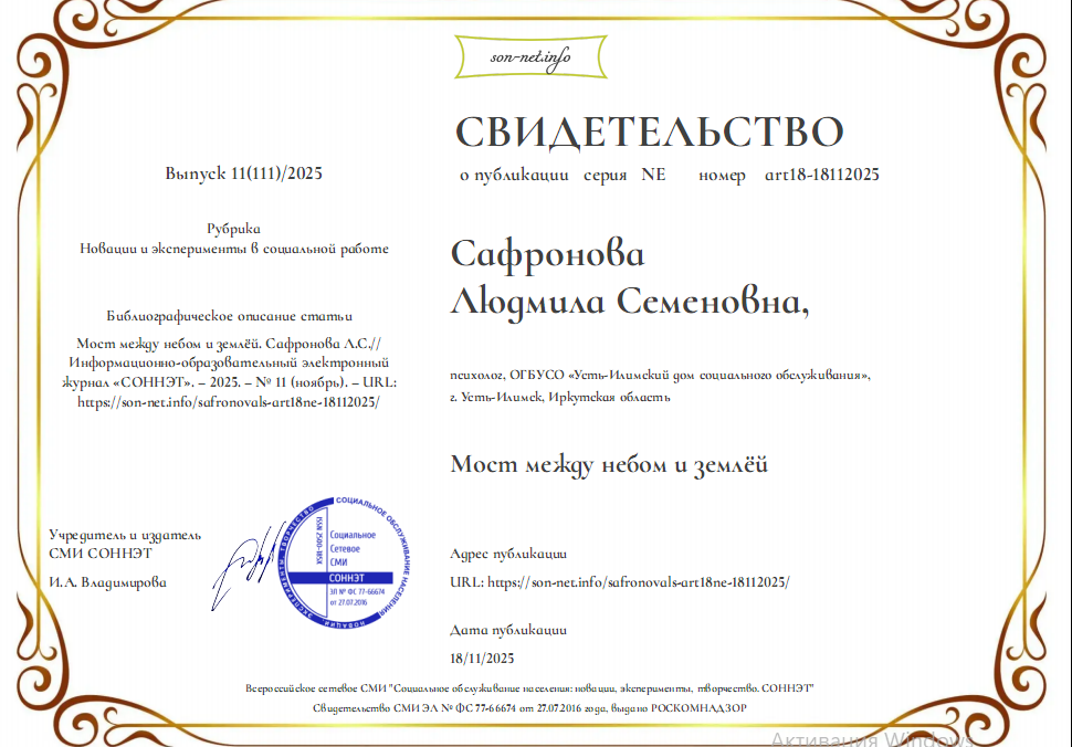 В электронном журнале социального обслуживания населения «СОННЭТ» в рубрике «Новации и эксперименты в социальной работе» уделено особое внимание статье «Мост между небом и землёй»