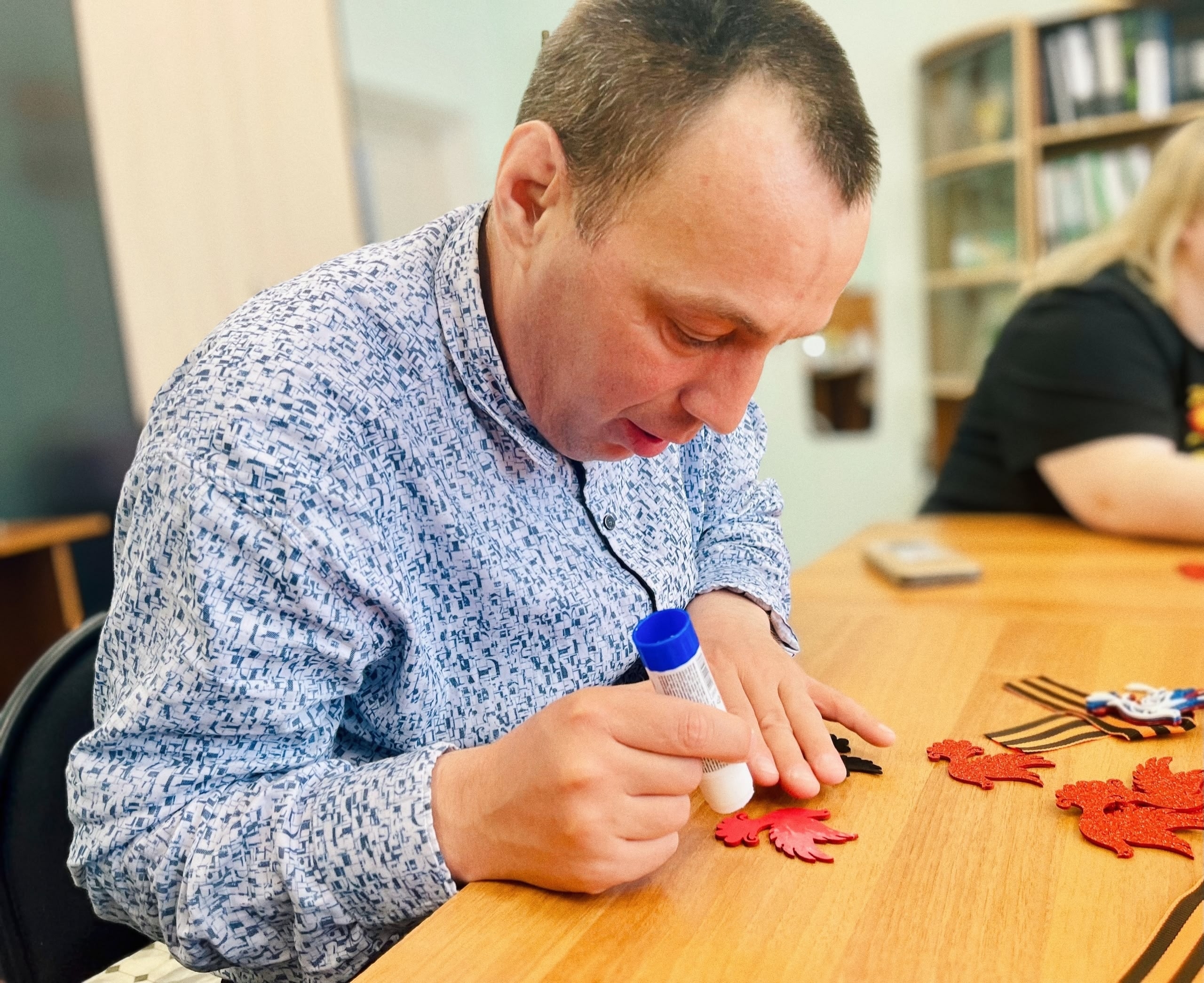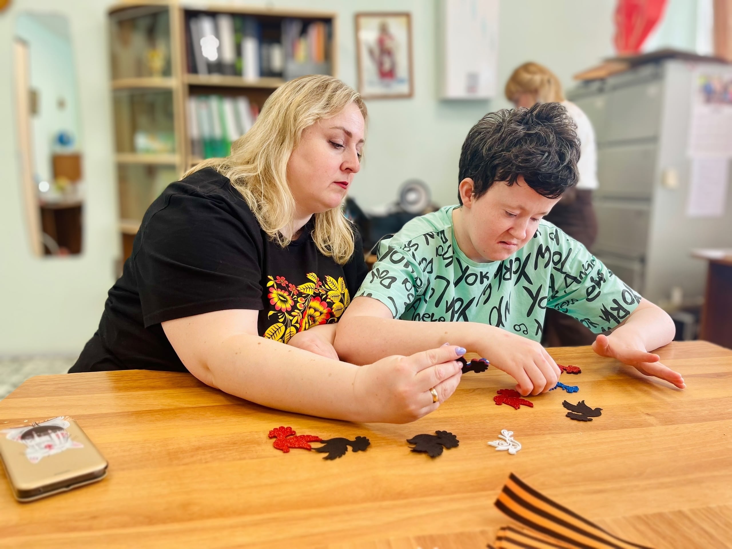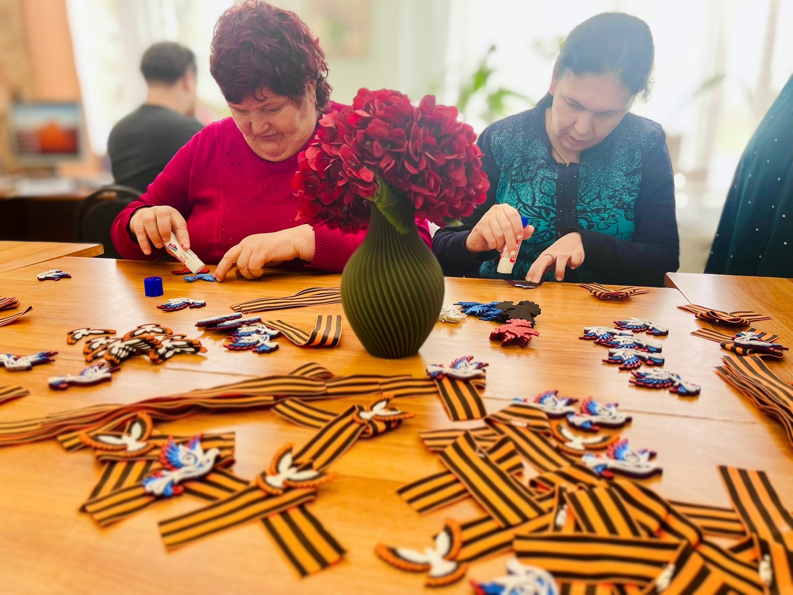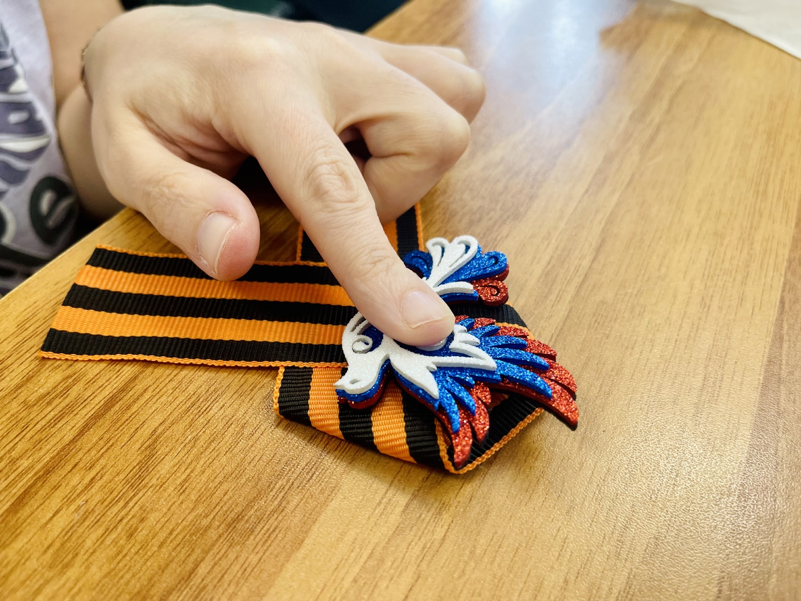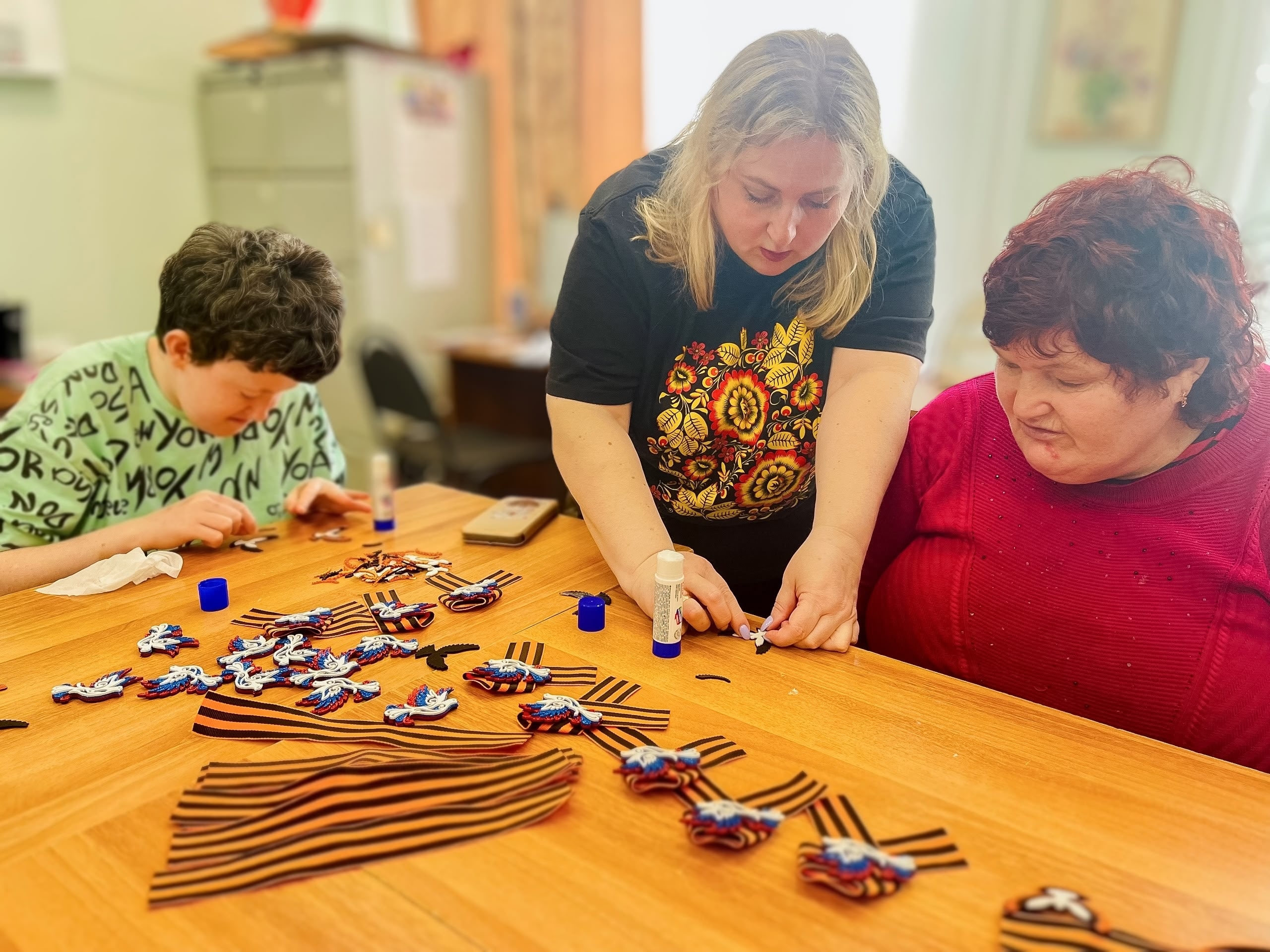 Подопечные Усть-Илимского дома с уважением присоединились к акции: в рамках социальной занятости трепетно учились украшать георгиевские ленты дополнительной, значимой символикой.